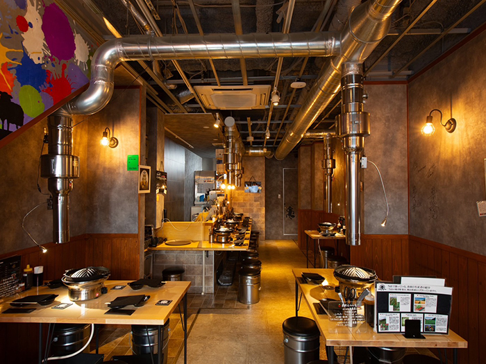 有名画家の“takumi”先生に、筆をとってもらい、壁面に直接描いて頂きました。大きなダクトがあるため、空間を広く感じられるように、綿密に設計されたお席で食べる、煙を気にすることなく、お楽しみいただける空間となっております。